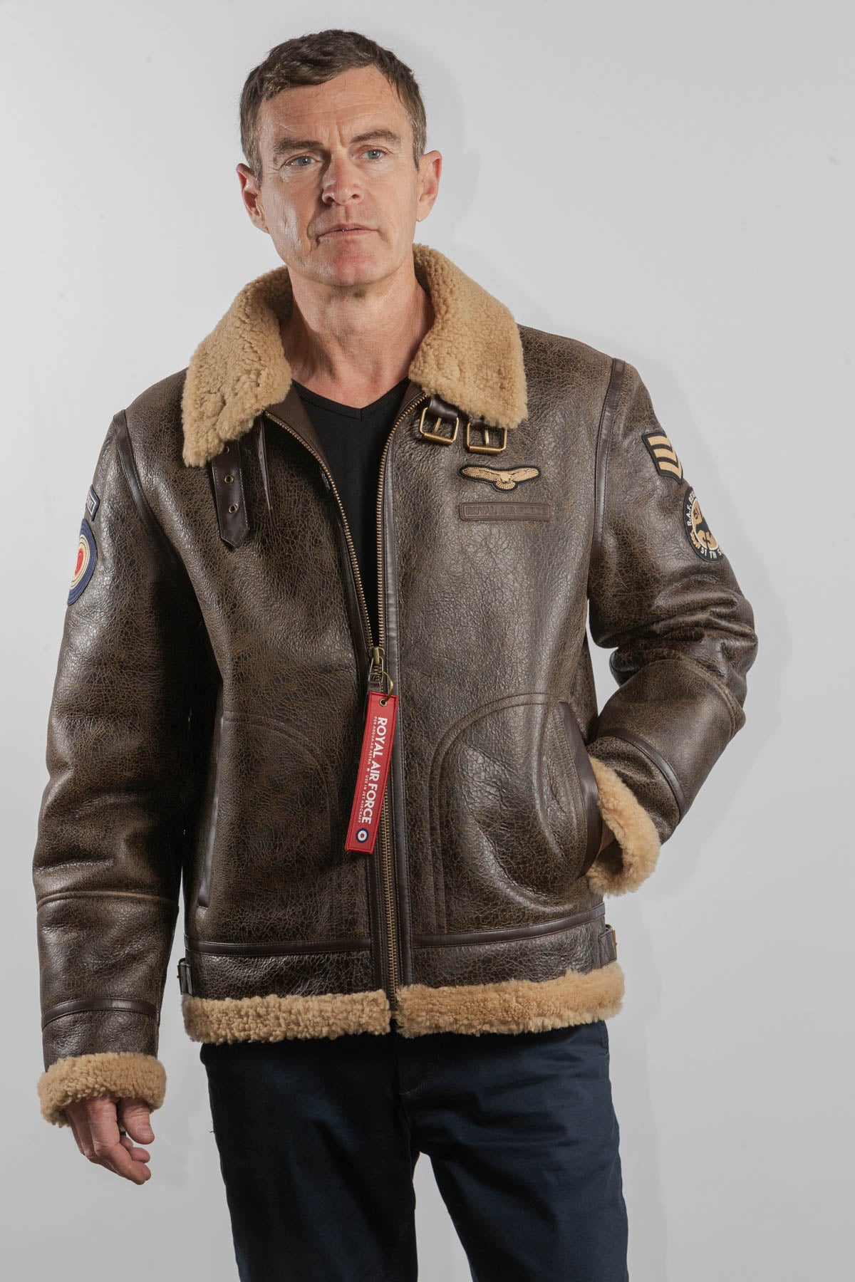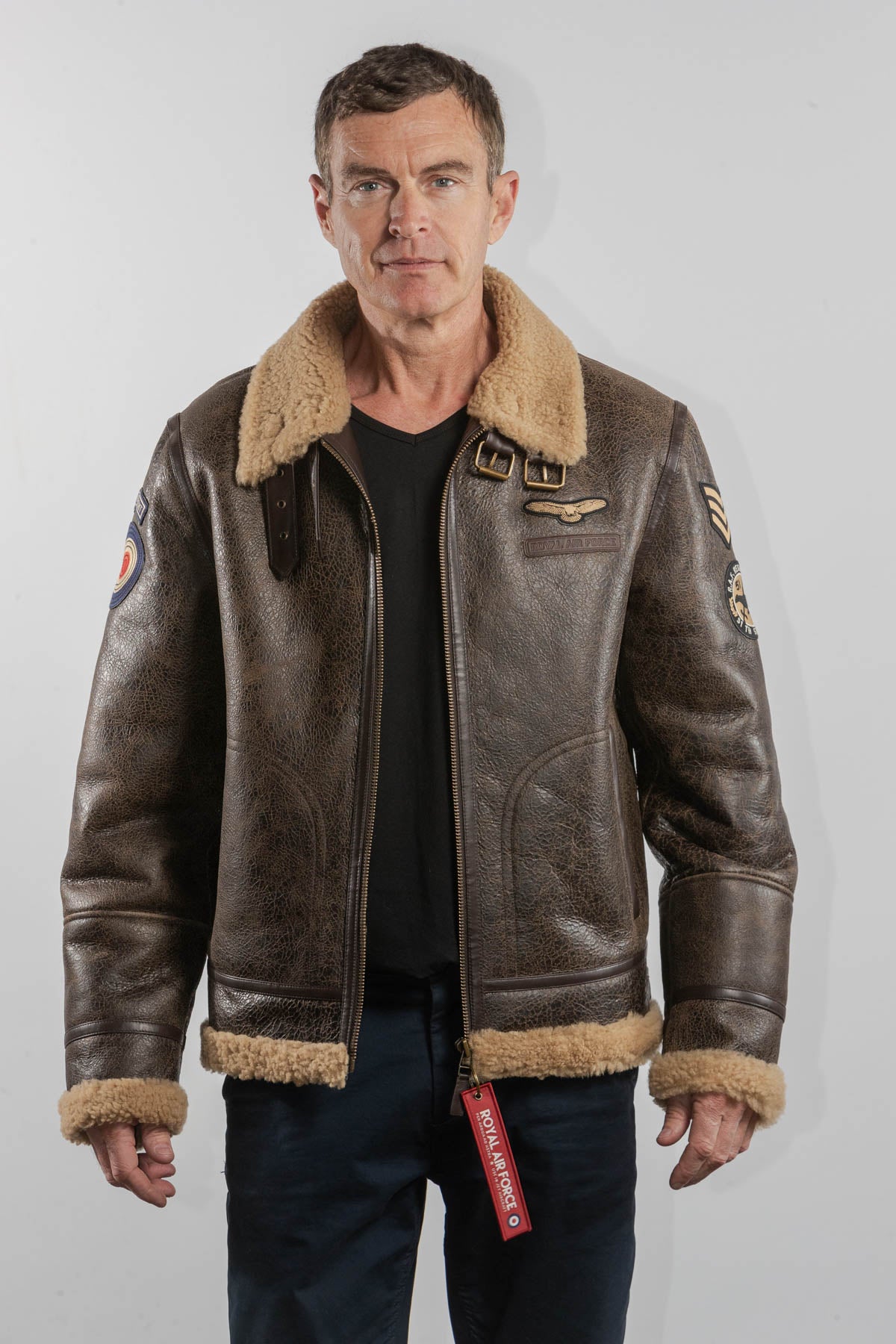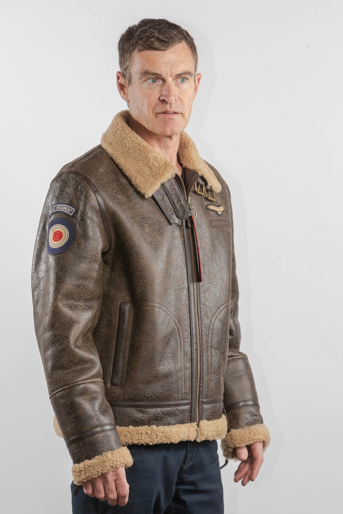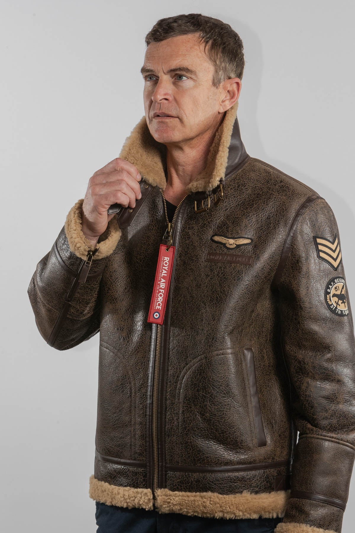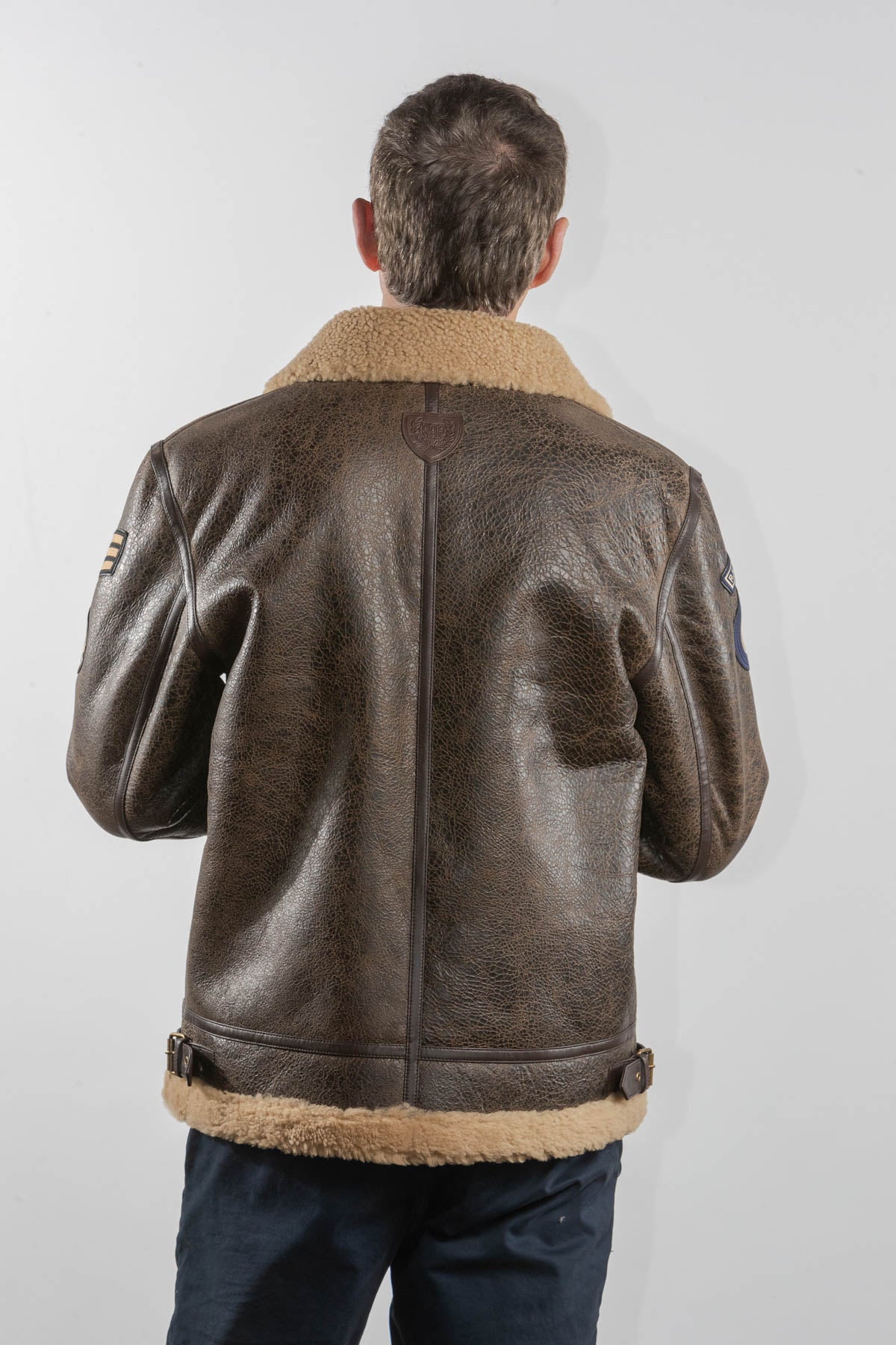 Ce modèle est un Blouson en cuir de type bombardier de la couleur marron fabriqué en mouton retourné.