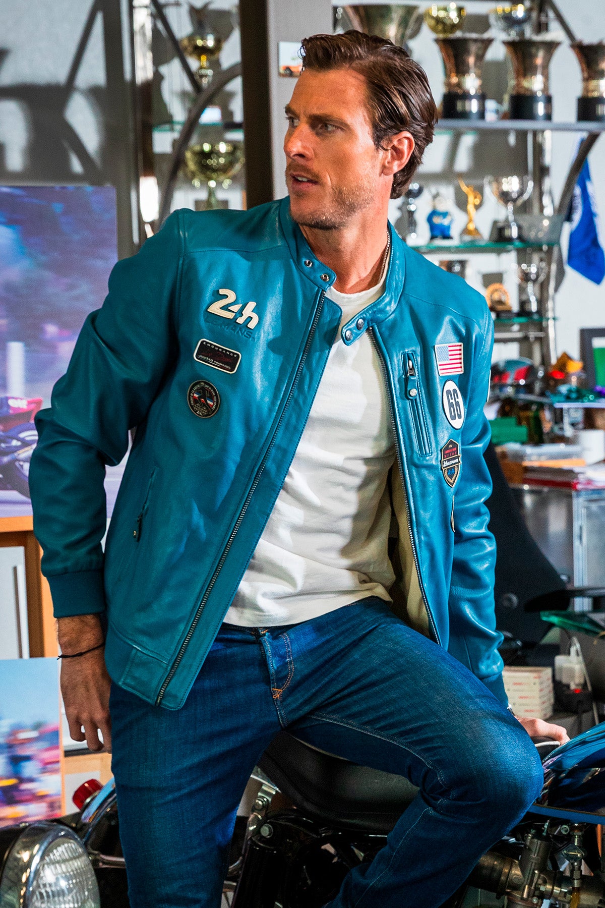 Blouson en cuir 24H Le Mans Pierre bleu mallard Homme